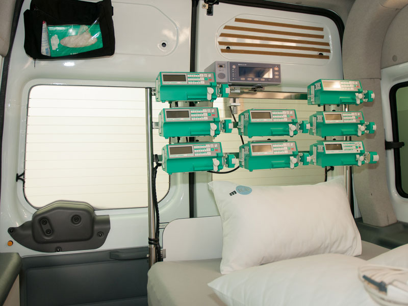 In den meisten Fällen ist es möglich auch diese Patienten im mICU-Alps Intensivbett zu transferieren. Bei Bedarf wird der Transport in einem eigens für diese Transferierungen konzipierten Fahrzeug durchgeführt. Das Schwerlast Fahrzeug der mICU-Alps ist so konzipiert, dass es sowohl die mICU-Alps Transferierungseinheit als auch ein Luftkissenbett inklusive intensivmedizinischem Standardequipment wie bei der Erwachseneneinheit aufnehmen kann.