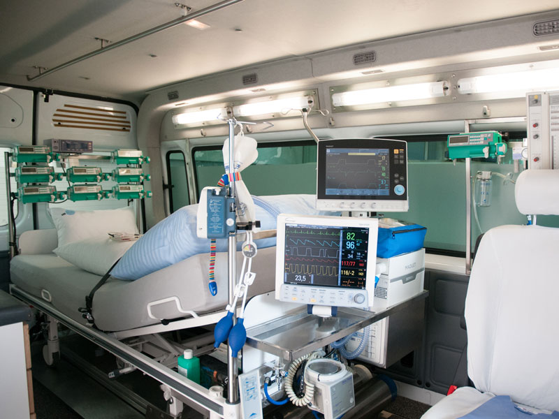 Zur Ausstattung zählen intensivmedizinisches Standardequipment sowie Backup-Systeme wie ein zweiter Intensiv-Respirator, Monitoring, Perfusoren. Sämtliche für die Pflege am Transport notwendigen Utensilien werden mitgeführt. Um eine für den Betrieb möglichst hohe Sicherheit zu erlangen, verfügen sämtliche Fahrzeuge über eine reduntante Stromversorgung auf 220 V Basis.